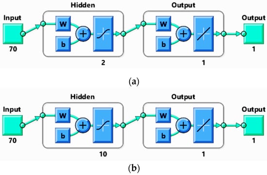 Neural network diagrams used in this study: (a) using two hidden layers and (b) using 10 hidden layers. As input parameters, the four aforementioned clusters have been used.