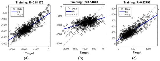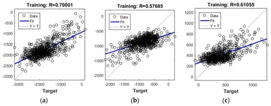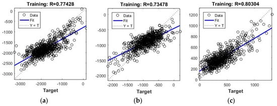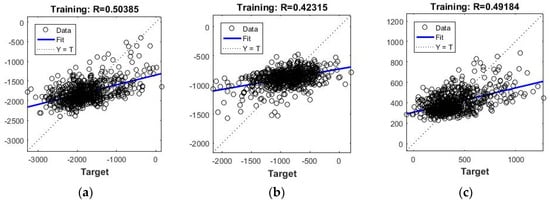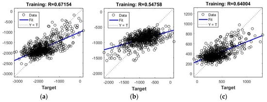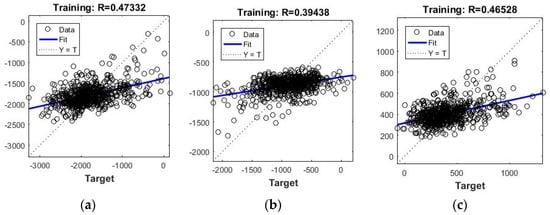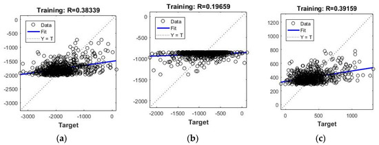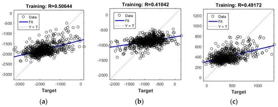BNN two hidden layers fitting results based on the 85% of the samples: (a) Group of hyperspectral vegetation indices against GPR slice depth between 0.00–0.20 m; (b) Group of hyperspectral vegetation indices against GPR slice depth between 0.20–0.40 m; and (c) Group of hyperspectral vegetation indices against GPR slice depth between 0.40–0.60 m.
