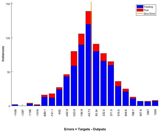 Error histogram obtained after the application of BNN two hidden layers using the hyperspectral vegetation indices as an input parameter and the GPR slice depth between 0.00–0.20 m results as targets.
