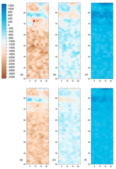 The overall performance of the fusion models was directly compared with the real GPR depth slices. For this task, the BNN fusion model generated using the hypespectral indices cluster, which provided high regression values for all three depth slices has been used. The application of the BNN fusion model was once again performed in the MATLAB environment. The GPR results acquired at the archaeological site of Vésztő-Mágor Tell—over the area shown in red polygon at Figure 1—are demonstrated in Figure 12a–c. The fused BNN results are shown in Figure 12d–f for the depth slices 0.00 up to 0.60 m. A linear horizontal feature exists at around 75–80 m north at all GPR depth slices (indicated with red arrow) up to a depth to 0.60 m. The same anomaly can be also observed in the BNN fused model (Figure 12d–f). Absolute differences (i.e., GPR results—BNN results) can be obviously reported between the real and the fused models (see results in Figure 13). These absolute differences are scattered accross the whole area of investigation, whereas no any specific pattern distribution can be seen for the three depth slices (Figure 13a–c).