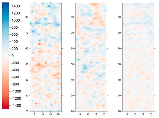 Errors observed between the GPR in measurements (see Figure 12a–c) and the BNN fusion model (see Figure 12d–f) for the depth slices between 0.00–0.20 m (a), 0.20–0.40 m (b), and 0.40–0.60 m (c). Higher amplitude error values are shown with red colour while lower amplitude error values with blue.