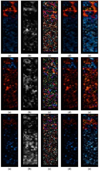 Results from the (a) bias, (b) image entropy, (c) ERGAS (erreur relative globale adimensionnelle de synthèse), (d) RASE (relative average spectral error), and (e) RMSE (root mean squared error) quality image methods. The first row refers to the first depth slice (0.00–0.20 m), the second row to the 0.20–0.40 m depth slice and the third row to the 0.40–0.60 m depth slice. Red values represent higher mismatch between the ‘real’ image (GPR) and the ‘modeled’ image (BNN model) while blue color lower values. The radiometric scale of the images was set to 8 bit (0–255).
