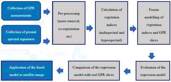 An overall methodology of the proposed work is demonstrated in following Figure 15. The various steps include the collection of the ground datasets (GPR and ground spectroradiometric measurements) over the same area and their pre-processing steps for noise removal and co-registration of the data. It should be mentioned that the collection of the ground datasets should be carried out almost simultaneously so as to minimize any phenological changes of the crops and soil moisture levels. Then various multispectral and hyperspectral indices can estimate using the ground spectral signatures as these are described in Table 1 and Table 2. The next step includes the fusion modeling between the vegetation indices and the different depth slices based on BNN. The results are then evaluated and compared with the in-situ GPR measurements. This step is of high importance since it will assess the overall performance of the fused model with the different GPR slices. Once the fused model is acceptable, then this can be applied to satellite image.