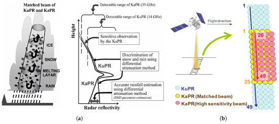 (a) Concept of DPR dual-frequnecy observation. Image source: Senbokuya et al. [5]; (b) GPM-DPR scan strategy. Image taken from GPM Level 2 algorithm theoretical basis document [10].