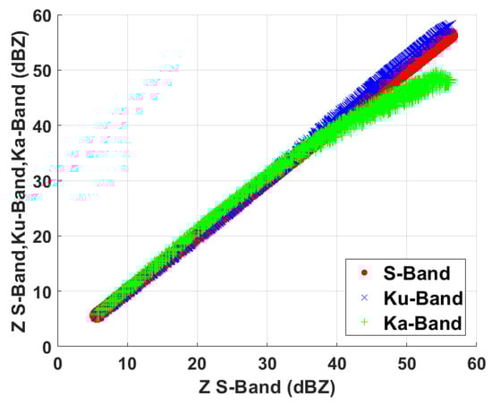 The difference between S, Ku, and Ka-band reflectivities obtained from the simulation is shown in Figure 2. It can be observed that Ku-band reflectivity values up to 35 dBZ are almost equal to S-band while Ka-band reflectivity values are almost 1 dB higher than S-band. From 35 dBZ onward, due to increase in drop size, non-Rayleigh scattering effect start to crop in and thus a deviation can be seen in both Ku-band and Ka-band. Beyond 50 dBZ this deviation becomes more severe. In the region of 35–50 dBZ, Ku-band reflectivity can be 2 to 3 dBZ higher while Ka-band reflectivities can be 5 dBZ lower compared to S-band. These results are consistent with the findings in [40,41].