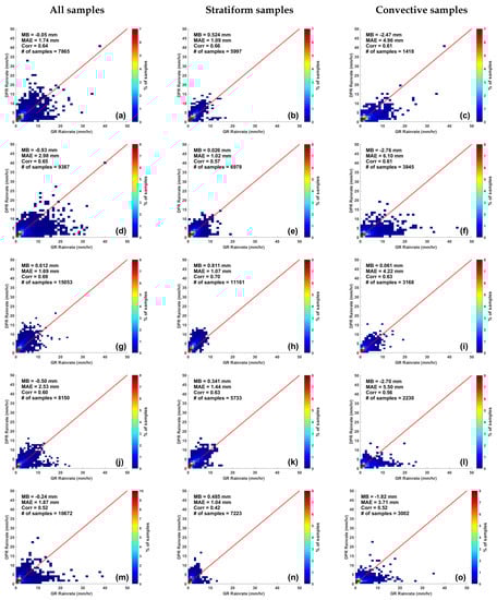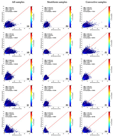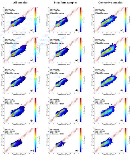 Attenuation in DPR outer swath is corrected by a combination of Surface Reference Technique (SRT) and Hitschfeld and Bordan (HB) method [45] while in inner swath a modified HB-SRT-DFR method [27] is used. These correction methods do not always work well for heavy precipitation [27]. Thus, to better understand the effectiveness of attenuation correction, volume matched samples are further classified into stratiform and convective rain. DPR data are flagged according to the precipType flag from Profile Classification Module of the DPR Level 2 algorithm. A dual-frequency method [46] is applied in the inner swath where both Ku- and Ka-band data are available. In the outer swath, a single frequency approach [47] is adopted.For GR data classification, matched volume samples are chosen according to the DPR classification algorithm. The first column of both Figure 4 shows scatter density plot between attenuation corrected KuPR reflectivity and GR reflectivity when all volume matched samples are considered together. The second and third column are similar but only for stratiform and convective volume matched samples, respectively. Figure 5 is same as Figure 4 but for attenuation corrected KaPR reflectivities. Statistical scores together with the number of samples used are shown on each plot. From both Figure 4 and Figure 5, It can be observed that, even though there are differences between DPR and GR matched samples, data are heavily clustered along the 1:1 line and within the bounds of dB lines. Statistical scores shown on the scatter plots are summarized in Table 2.