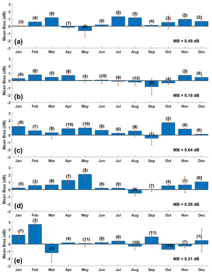 In Figure 6, MB for each radar over the months are shown in blue bars with red lines on top representing standard deviation. It can be seen that the calibration of all radars is relatively stable over the time period with occasional jumps of a few dB at some radar sites. The MB is seen to vary from −1.1 dB to 2.5 dB. Other than factors such as difference in back scattered power at higher frequency and DPR attenuation correction algorithm performance, rainfall climatology can be a significant factor for the variability of MB over different months. The southeastern part of USA experiences a wide range of weather events, from severe thunderstorms, wide spread stratiform and mesoscale convective systems to tropical cyclones. During spring, sharp changes in temperature gradient along with varying humidity facilitate development of hail producing thunderstorms. The summer season is typically warm and moist and characterized by frequent convective thundershowers. During late summer, tropical cyclones also cause torrential rainfall upon interacting with frontal systems [48]. During the cooler months, it experiences comparatively light rainfall from widespread stratiform events. The DPR-GR bias is mostly positive and near to zero during this season which can be noticed in case of KFWS, KSHV and KLIX radars. The KMLB radar shows an exception of high positive bias for the month of February. It should be noted that there are only two overpasses for this month which might not be sufficient for truly capturing the nature of the bias. Also, in convective precipitation, when the Ku-band signal attenuation is significant the correction algorithm can sometime change the raw radar reflectivity by a factor of 10 compared to the corrected value (Iguchi et al. 2000). During light rain events, the DPR’s SRT can sometimes yield negative amount of attenuation correction (Schwallar and Morris 2011). This might be a reason of negative DPR-GR bias which can be noticed for some of the cool season months for radars KHGX, KLIX and KMLB. A noticeable deviation can be observed in case of KFWS radar which shows negative bias for the month of May. The Dallas Fort Worth region is known for observing damaging hail storms during the summer. This can be the cause for the heavy attenuation of Ku-band signal and poor performance of the attenuation correction algorithm. Nevertheless, errors in GR hardware systems during these overpass events can be another cause for sudden jumps in biases.