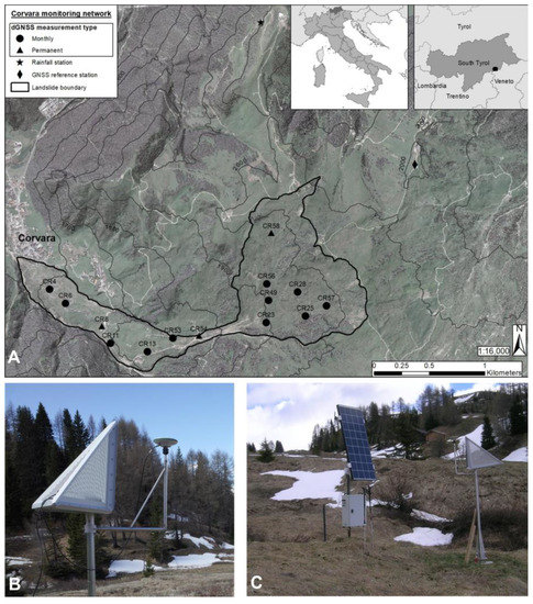 Landslide monitoring network location and field impressions: (A) Landslide monitoring network; (B) monthly measurement station consisting of an X-band corner reflector and a support for the DGNSS antenna; (C) permanent DGNSS station, solar panel for power supply, and X-band corner reflector. DGNSS: differential global navigation satellite system.
