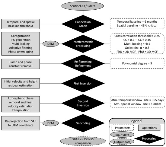 - De Luca, C.; Bonano, M.; Casu, F.; Fusco, A.; Lanari, R.; Manunta, M.; Manzo, M.; Pepe, A.; Zinno, I. Automatic and systematic Sentinel-1 SBAS-DInSAR processing chain for deformation time-series generation. Procedia Comput. Sci. 2016, 100, 1176–1180. [Google Scholar] [CrossRef]