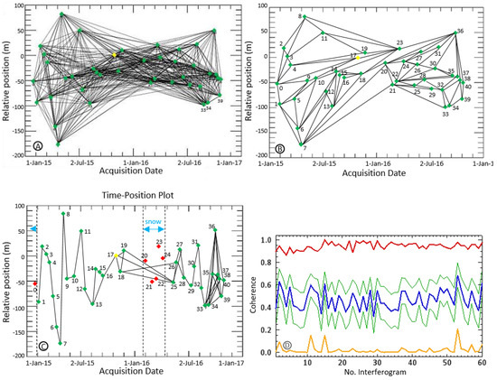S1 SAR acquisition connections. (A) Perpendicular baselines (indicating a maximal spatial baseline of 174 m) between different image acquisitions according to their relative position (570 interferograms; yellow and green points indicate the master and slaves, respectively); (B) Delaunay connections for 3D phase unwrapping; (C) final connection graph after discarding pairs with a mean coherence less than 0.2 (the gray dashed lines present the snow time span, the black lines between acquisitions show the remaining connections, and the red dots indicate the discarded data); and (D) min/max (orange/red colors), mean-Std/mean+Std (green colors), and mean (blue color) coherence (within the landslide boundary) of the remaining pairs (i.e., 60 interferograms) after the graph editing.