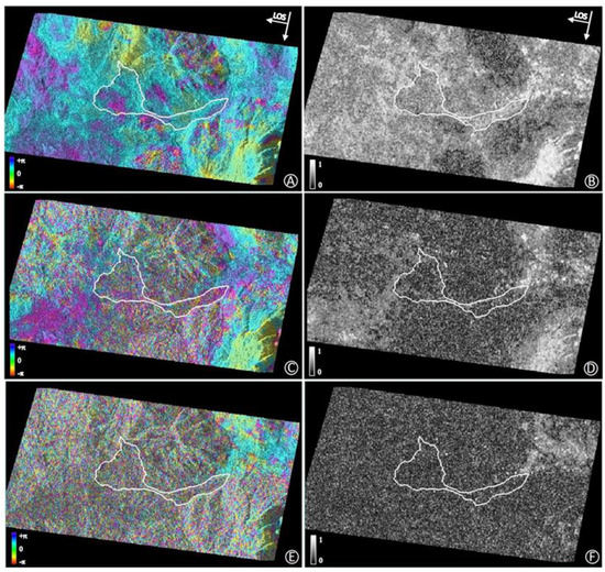 The effect of seasonal, temporal baseline, and surface scatterers’ decorrelation on phase (left) and coherence (right). (A) Coherent interferogram showing the effect of the short baseline (i.e., 6 days) on the phase and (B) coherence related to the pair of 19–25 Oct 2016. (C) Phase values affected by decorrelation caused by vegetation and (D) coherence related to the pair of 6 June–3 July 2015. (E) Phase values affected by decorrelation caused by snow and (F) coherence related to the pair of 2–28 February 2016. The white polygon shows the boundary of the Corvara landslide. All images are presented in the SAR geometry.