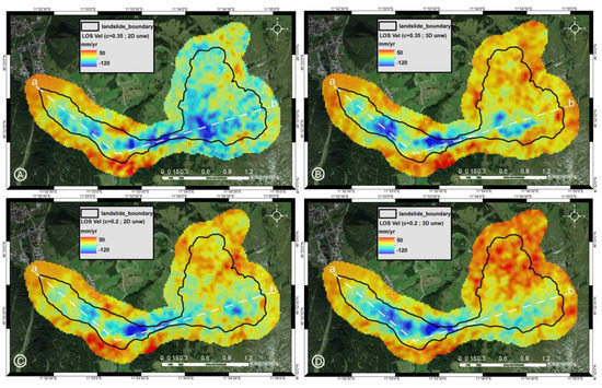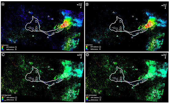 Comparison of interpolated SBAS LOS velocity maps (A) with an unwrapping coherence threshold (CC) of 0.35 and 2D PhU, (B) with CC of 0.35 and 3D PhU, (C) with CC of 0.2 and 2D PhU, and (D) with CC of 0.2 and 3D PhU. The spatial interpolation applied to the results of the DInSAR processing chain is meant to spatially preserve the results’ continuity, avoiding discontinuities between pixels of low coherence. The figures show the terrain-corrected results in the UTM reference system.