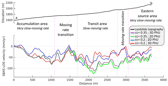 Cross-section comparison of DInSAR results and landslide movement rates. CC represents the coherence thresholds and PhU the phase unwrapping process. The topography profile a–b is divided into (1) an accumulation area, (2) a first transition, (3) a transit area, (4) a second transition, and (5) a source area. Since the movement direction of the right side of the landslide, corresponding to the “b” profile, is not aligned to LOS (based on the DGNSS measurements of Figure 8), the SBAS velocity for this part of the landslide was projected to the “b” profile alignment to avoid underestimating the velocity. The green and purple lines overlapped each other at the left part and then separated at the distance of 1500 m.