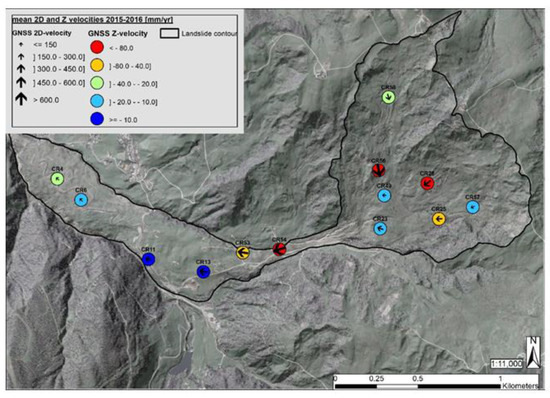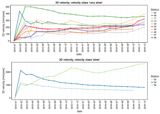 Figure 8 shows the mean annual horizontal and vertical velocity as well as the azimuth angle of the DGNSS benchmarks on the Corvara landslide. Station number 8 had been manipulated several times between October 2015 and November 2016 and therefore it had to be excluded. Time series of measured 3D displacements at 13 stations from the source, track, and accumulation zones are plotted in two different charts, according to the velocity classes of Cruden and Varnes [42] (Figure 8). The 3D displacements measured in 2015 and 2016 range from 176 mm (at station 6 in the accumulation zone of the landslide) to 4956 mm (at station 56 in the source zone of the landslide).