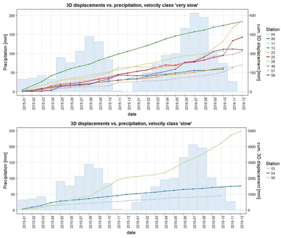 For the DGNSS stations in the source zone (23, 28, 49, 56, 57, and 58), a deceleration during winter and an acceleration during spring and summer months can be observed (Figure 9). The displacement follows the rainfall rates, which could be explained by the fact that at the upper zone of the landslide, the authors of [41] found the groundwater table to be close to the surface. It can be assumed that this favors a quick response of the terrain to rainfall in terms of movement. Regarding the track zone, the movement pattern of the stations 13, 53, and 54 does not follow a seasonal trend, but shows a more steady movement behavior.