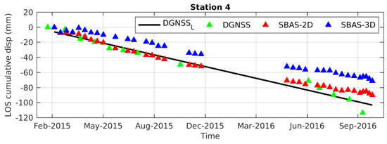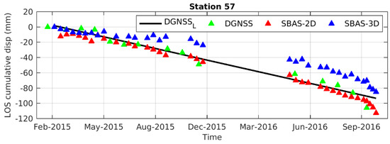 As an indication of measurement differences by ground-based instruments and DInSAR, the cumulative displacement of the stations 4 (located at the toe of the landslide) and 57 (located in the eastern depletion area) are represented in Figure 11. The CC of 0.35 with 2D and 3D PhU methods was used to create the plots. The frequency and acquisition dates of monthly DGNSS and SAR data were not identical; therefore, the DGNSS measurements were approximated by a linear model to make them comparable with the SBAS results. As observed previously, the 2D PhU gives measurements closer to the ground truth (red and green triangles in Figure 11).
