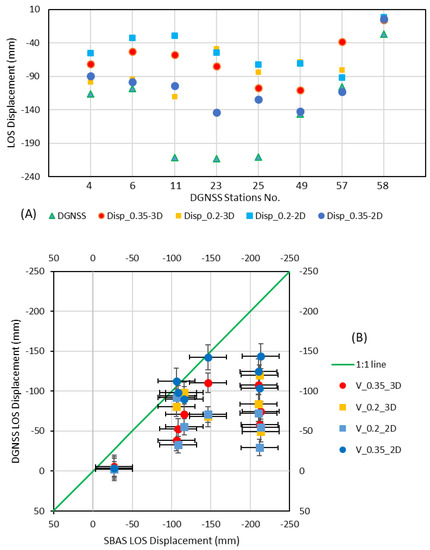 LOS DGNSS and SBAS results comparison. (A) Cumulative LOS displacement of the SBAS results versus the DGNSS measurement presented for each DGNSS benchmark. (B) Validation of the SBAS velocity as a function of the chosen coherence threshold and PhU techniques. The error bars indicate the standard error for each displacement measurement with their related parameters.