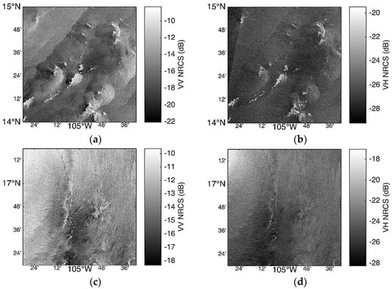 Although microwave radar is able to penetrate through cloud and light rain, because of its long wavelength as compared to the size of rain drops, heavy rainfall will modulate the radar signals through various mechanisms [21,22]. Study [22] summarized the effect of rain into two categories: In the atmosphere, raindrops induce volumetric scattering and attenuation of radar waves, whereas on the ocean surface, rain alters the roughness of the ocean surface by the competitive functions of rain damped ocean surface waves, and rain splashing enhanced ring waves. Although both negative and positive effects exist in the atmosphere and in ocean surface components of radar backscattered signals, the negative effects are dominant for high wind speeds [25]. A detailed quantification of each component is complicated. Nevertheless, all these effects will eventually be combined together and represented by the radar NRCS. In contrast to the stronger NRCS caused by higher winds under hurricane conditions, rain makes a relatively smaller contribution to the NRCS in high winds as compared to that made under moderate wind conditions. Figure 1 shows an example of rain features in Hurricane Patricia (2015), for moderate wind speeds (15 m/s), as compared to high wind speeds (35 m/s), where rain features are more prominent in (a,b) than in (c,d).