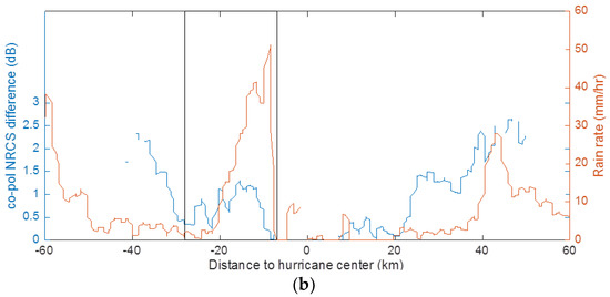 Figure 4 shows a comparison of both measurements along the SFMR track. The SAR-retrieved wind speed from the cross-polarization data reaches 85 m/s, and the SFMR peak wind speed indicates about 93 m/s, with simultaneous rain measurements showing strong precipitation in the hurricane eyewall area, located to the right of the peak wind as indicated by SFMR observations (Figure 4a). By adopting the hurricane inflow angle model [35] to CMOD5.N GMF, wind speed is also obtained from co-pol SAR measurements; the peak wind speed obtained by co-pol SAR observations is over 100 m/s (Figure 4b). Generally, for the rain-free area, both estimates for SAR winds are consistent with SFMR measurements. However, in the heavy rain area (>30 mm/h), the winds derived from co-pol SAR data underestimate the wind speed by about 20–30 m/s, whereas the cross-pol observations seem less affected. Figure 4 shows the underestimation of the SAR-derived winds in the heavy precipitation area, which once again confirms the overall attenuation effect of rain under hurricane-force wind conditions. This has previously been shown in the analysis of QuikSCAT measurements [24] and in our data in Figure 1.