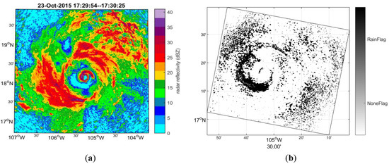 Radar reflectivity measured on board NOAA 43 flight at 05:30PM 23 October 2015: (a,b) rain flag of Hurricane Patricia at 12:45 UTC on 23 October 2015 as retrieved from SAR. Both figures show a heavy precipitation pattern in the shape of the number “6” in Hurricane Patricia. The observed spatial pattern in (a) is consistent with that of the rain index from SAR in figure (b).