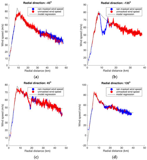 Wind speed in four radial profiles overlaid by Holland’s (1980) regression model in four directions: (a) −45°; (b) −135°; (c) 45°; and (d) 135°. The red curve is the VH SAR wind with rain-flagged values removed; the blue curve is with rain; black is the regression model.