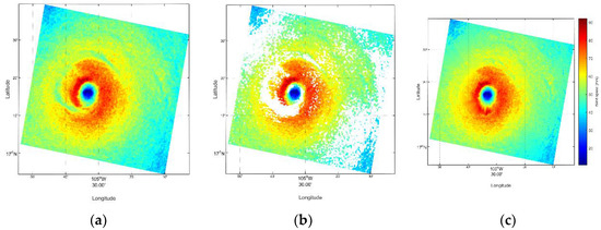 Wind field of Hurricane Patricia: (a) with rain; (b) with rain flagged; (c) after rain correction.