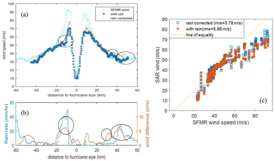 Comparisons of wind speed before and after rain flag along the NOAA flight. (a) Wind speed along SFMR track, (b) rain rate from SFMR measurements and associated speed difference from SAR, (c) scatterplot of wind speed before and after rain correction as compared to SFMR wind measurements. Note: the capability of the proposed method to recognize the strong precipitation areas is highlighted in the circled areas of (a,b).