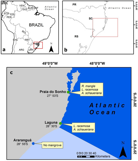 Study area at the eastern coast of South America. (a) Map of Brazil with Santa Catarina (SC) State marked in dark grey and the red rectangle is in detail above right; (b) SC State boundaries and the area within the red rectangle are shown in detail in the figure below; (c) detailed map of the Eastern South America mangrove limit located in Laguna, Brazil. The green circles represent the southernmost mangrove stands in Praia do Sonho and Laguna. The blue circle represents Araranguá estuary, beyond the Eastern South America mangrove limit. The pale yellow boxes list the mangrove tree species which occur, if any. Praia do Sonho and Laguna are located in the Southeastern Brazil marine ecoregion (dark blue on the Atlantic Ocean), whereas Araranguá, which is beyond the mangrove limits, is located in the Rio Grande marine ecoregion (light blue on the Atlantic Ocean). Laguna is very near to the boundary of the two marine ecoregions.