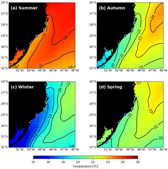 Seasonal fields of Sea Surface Temperature (SST): (a) summer (January, February, and March), (b) autumn (April, May, and June), (c) winter (July, August, and September) and (d) spring (October, November, and December). The isotherms and their associated temperatures are represented by the black lines and the respective values are shown. Seasonal averages were calculated from January 2003 to December 2017, since this is the period for which MUR-SST provides data for all months of the year. From north to south, the green circles indicate the locations of Praia do Sonho and Laguna, respectively, and the blue circle indicates the location of Araranguá.
