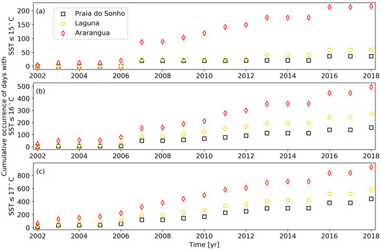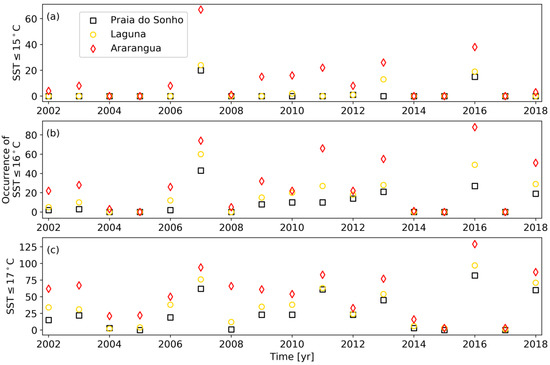 The number of occurrences of daily SST per year equal to or below the defined threshold. (a) Daily SST of ≤15 °C; (b) daily SST of ≤16 °C; and (c) daily SST of ≤17 °C. The SST data were analyzed for a period of 16 years (June 2002–September 2018).