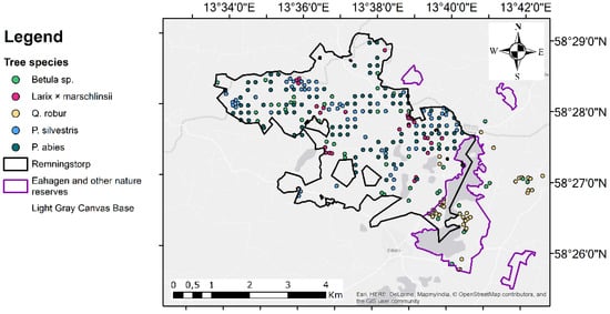 The study was carried out in the Remningstorp forest estate, the nature reserve Eahagen and nearby stands east of Eahagen in the county of Västra Götaland in central Sweden (58°30′N, 13°40′E); (Figure 1). This part of Sweden is located in the boreo–nemoral region and the natural forest cover consists mainly of conifers along with a minor share of broadleaves. The Remningstorp forest estate is 1500 ha and the forest cover consists of P. abies, P. silvestris, Hybrid larch (Larix × marschlinsii) and Birch (Betula sp.), with a minor presence of some other deciduous hardwood species. Mainly even-aged forest management is conducted on the forest estate.