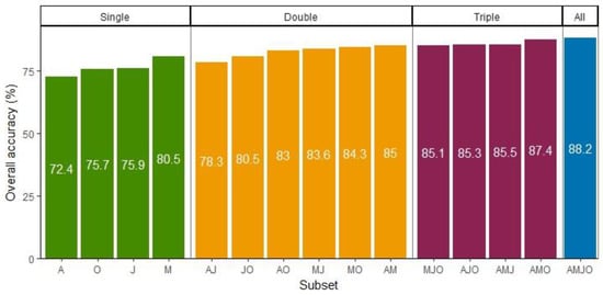 The overall accuracy (%) for individual RF models produced using all bands for single image, and multiple image combinations. The colors represent the number of satellite images used and the single letters indicate the image date: A = 7 April; M = 27 May; J = 9 July; O = 19 October.