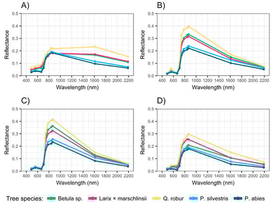 The mean spectral reflectance for each tree species illustrated for each image date: (A) 7 April, (B) 27 May, (C) 9 July and (D) 19 October. The data come from the extracted spectral information from the field plots.