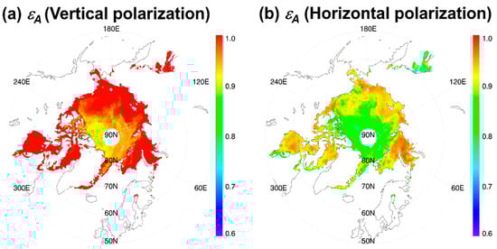 Apparent emissivities at the SSM/I 19.4 GHz channels are obtained by taking the ratio of SSM/I 19.4 GHz TBsfc to the sea ice emission temperature (TE), according to Equation (2). TBsfc here is from the measured TB after removing atmospheric effects, which are calculated using the line-by-line radiative transfer model of the Satellite Data Simulator Unit (SDSU)-version 2.1 [] with inputs of atmospheric temperature and humidity profiles from European Centre for Medium-Range Weather Forecasts Reanalysis (ERA)-Interim data []. The collocated TE is obtained from the AMSR 6.9 GHz retrieved SIIT, based on the finding that its emission weighting function is similar to that for 19.4 GHz. Figure 1 shows the spatial distributions of the apparent emissivities for both polarizations at 19.4 GHz on 1 January 2004. The obtained apparent emissivities are used for calculating the so-called “correction factor” described in Section 3.3.