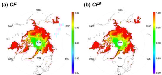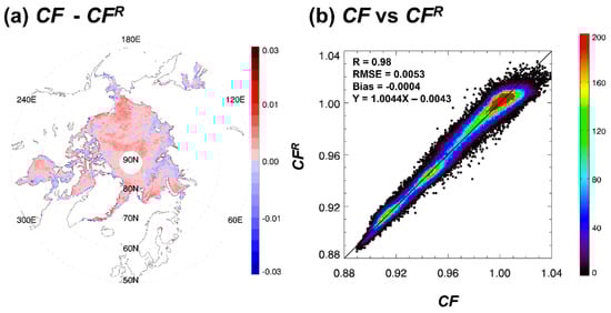 It is noted that the obtained coefficients are slightly different between polarizations, but spatial distributions and magnitudes of CFR at both polarizations are nearly identical (not shown). It is thought that the surface scattering influence on the apparent emissivity appears to be minor for sea ice in the case of the 19.4 GHz frequency, in spite of surface scattering capable of affecting the polarization state []. By applying the regression equation, geographical distributions of CFR are obtained for 1 January 2004 (Figure 2b), which can be compared with the AMSR-derived CF in Figure 2a. The figure shows that they are in good agreement, with small regional differences within 0.05 over the Arctic Ocean (Figure 3a). The scatterplot between CF and CFR for one month (January 2004) also clearly shows that regression-based SSM/I CFR retrievals are comparable to the direct CF, showing a correlation coefficient of 0.98. The bias and RMSE in this comparison are −0.0004 and 0.0053, respectively. In order to examine the robustness of the regression Equation (8), regressions were performed with different combinations of 8 years in the 2003–2011 period. Each year’s comparison between CF and CFR indicated that there exists a clear linear relationship between those two, with correlation coefficients above 0.97, regardless of the year given in Table 2. This suggests that the regression coefficients obtained in this study work well for other years. Because of this, we apply the coefficients in Table 1 to the whole SSM/I period.