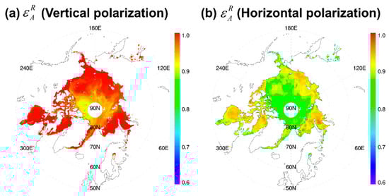 Equation (A8) consists of two parts for each polarization and three unknowns (Nr, σ, and τsca). In order to solve Equation (A8), information on one of three unknowns should be ready. In this study, we employ Nr calculated in accordance with Reference [] by assuming a spectral invariance of Nr in the MW frequencies especially for Arctic sea ice []. At this point, σ and τsca can be obtained from Equation (A8) if the apparent emissivity is known.