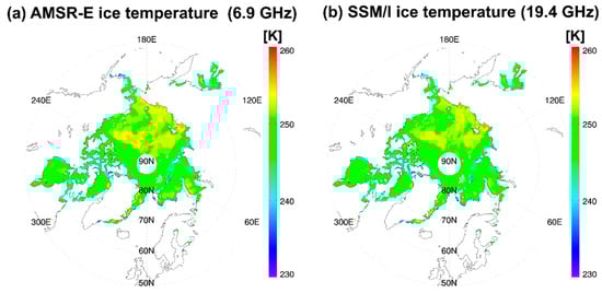 In this study, we use FCDR SSM/I 19.4 and 37.0 GHz vertically and horizontally polarized TBs to retrieve the sea ice temperature. The SSM/I sensors have measured MW TBs with a viewing angle near 53° since 1987. The sensors aboard different platforms are physically consistent but depend on varying orbital and navigational quantities such as the incident angle, resolution, and observation time. The objective of SSM/I FCDR data is to generate consistent and well-calibrated MW TBs from 1987 onwards by using multiple techniques for intercalibration [,]. In this study, these SSM/I FCDR orbital data were converted to 25 km Equal-Area Scalable Earth (EASE)-grid data, on a daily basis, to collocate SSM/I data with gridded AMSR-E TBs and SSM/I bootstrap sea ice concentration data []. More information on the SSM/I FCDR dataset can be found in References [,] and on the webpage of the Precipitation Research Group of the Department of Atmospheric Science of the Colorado State University (http:/rain.atmos.colostate.edu/FCDR/).
