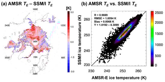 A scatterplot of the temperature difference between two for January month of 2004 is provided in Figure 6b. Most of the pairs are near the one-to-one line, implying that both temperatures have a strong linear relationship. The corresponding statistics show a high correlation coefficient of 0.97 and bias (RMSE) of 0.007 K (1.01 K). It is noted that some points off the 1:1 line are in the boundary area between sea ice and open water, where water exposure often contaminates the MW measurement scene.