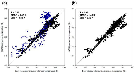 (a) Scatterplots between CRREL IMB buoy-measured snow/ice interface temperature (x-axis) and SSM/I-derived temperature (y-axis), from (a) all 13 buoys, and from (b) buoys after the quality check is applied.