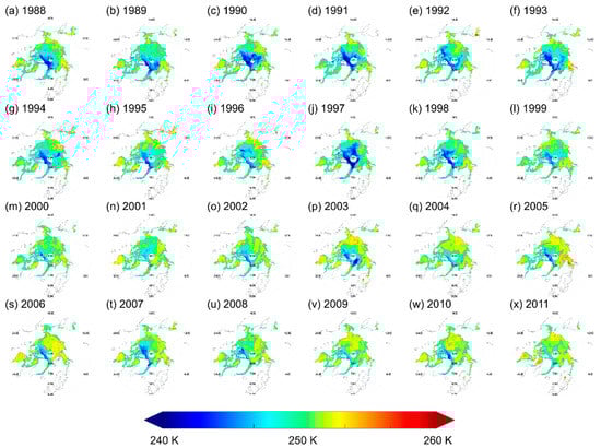 (a–x) Retrieved December Arctic snow/ice interface temperature from SSM/I FCDR data from 1988 to 2011.
