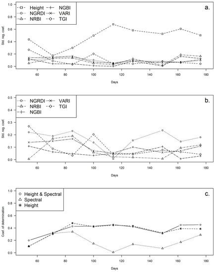 The Figure 3 shows the result of modeling approach 1 (mixed final AGB model). In Figure 3a we can see that the mixed models based on different spectral indices and crop height vary slightly among each other but behave similarly over time. Nevertheless, adding height information to the model improves the quality of the AGB prediction, especially after 100 days after sowing (DAS). The lower relative interest for height data in the early growing stages (before 100 DAS) can be linked to the lower height differences between individual crops at the beginning of the crop growth. The interest of spectral data can mainly be associated with the early crop development stages. Figure 3b highlights the performance of models only based on spectral information. There is no particular individual index performing clearly better than the others and their performance depends on the growing stage of the crop. UAV data acquired more than 80 DAS does not contribute notably to the quality of the final AGB prediction (Figure 3c). Since the combination of both data (spectral and height) works out best, this set-up was kept for the following modeling activities.