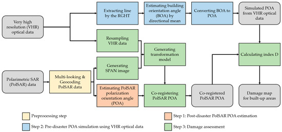 Figure 2 shows a block diagram of the proposed method, which consists of a preprocessing step and three main steps. The preprocessing step of PolSAR data is required for registration, as described in Section 3.3.1. The three main steps are: (1) Post-disaster PolSAR POA estimation; (2) pre-disaster POA simulation using VHR optical data; and (3) damage assessment. A detailed explanation of each step is as follows.