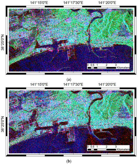 Pauli RGB images of (a) ALOS/PALSAR-1 on April 2, 2009; and (b) ALOS/PALSAR-1 on 8 April 2011. , , and are assigned to the Pauli RGB channel.