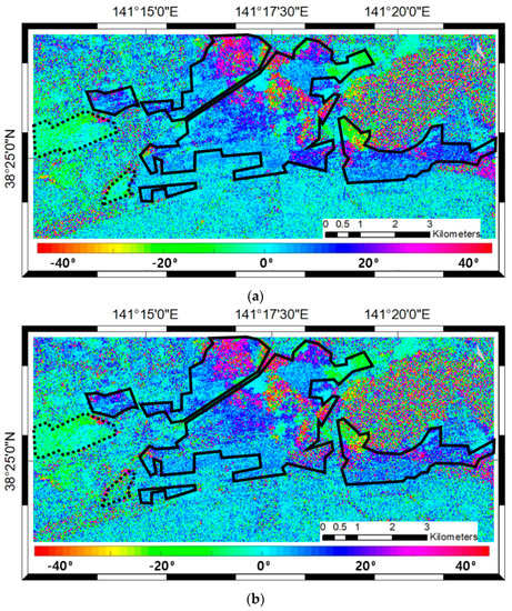 Estimated POAs using PolSAR data: (a) POAs from ALOS/PALSAR-1 on 2 April 2009;and (b) POAs from ALOS/PALSAR-1 on April 8, 2011. The range of the PolSAR POAs is from −45° to 45°. The densely built-up areas are highlighted with black solid lines. The areas highlighted with black dotted lines are the sparsely built-up areas.