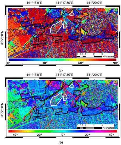 Figure 7 shows the PolSAR POAs derived from the pre- and the post-tsunami ALOS/PALSAR-1 data using Equation (5). The built-up areas manually delineated using the VHR optical data are highlighted with black lines. It is found that the POA values of the built-up areas are relatively homogeneous compared to areas with other types of landcover, such as forests and croplands. The homogeneous values are caused by the groups of parallel buildings, as mentioned in Section 2. The built-up areas can be divided into several homogeneous patches according to their dominant POA values. Some of them in Figure 7a near the seashore have fluctuated POA values in the post-tsunami POAs, as shown in Figure 7b. It is expected that the damaged areas can be distinguished, based on the difference between the POA distributions.