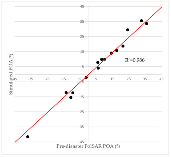 As the simulated POAs are highly correlated with the estimated BOAsaz, the accuracy of BOAsaz was first evaluated (Table 2). The root mean square error (RMSE) of the estimated BOAsaz for the 15 selected areas is 2.956°. The minimum difference between them is −3.055°, and the maximum is 6.522°. These values indicate that the building orientation in a window was accurately estimated by the simple approach using the RGHT and the directional means. Furthermore, Table 2 shows the directional means and dispersions of the simulated POA values and the pre-disaster PolSAR POA values for the 15 selected areas. The RMSE between the directional means is 2.761°. The scatter plot in Figure 9 shows the directional means of the simulated POAs versus the pre-tsunami PolSAR POAs for each selected region. The scatter plot with a R2 value of 0.986 confirms that the simulated POAs are in good agreement with the PolSAR POAs. The quantitative comparison demonstrated that the PolSAR POAs in built-up areas can be accurately simulated from the VHR optical data using the proposed approach. This implies the simulated POAs can be alternatively used when the pre-tsunami PolSAR data is unavailable.
