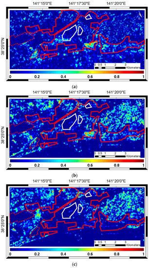 Damage level map by the index D using: (a) The pair of pre- and post-tsunami ALOS/PALSAR-1 data (P1); (b) the pair of pre-tsunami KOMPSAT-2 data and post-tsunami ALOS/PALSAR-1 data (P2); and (c) the pair of pre-tsunami KOMPSAT-2 data and pre-tsunami ALOS/PALSAR-1 data (P3). The index D values range from 0 to 1. The higher the D value is, the higher the damage level is. The built-up areas with high and low density are highlighted with red solid and dotted lines, respectively. The clouds are highlighted with white lines.