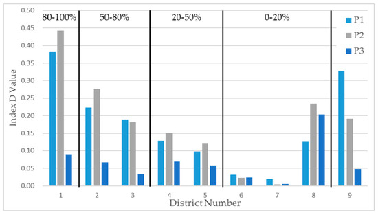 The mean values of the index D values in each selected district from P1, P2, and P3. The damage level is annotated in the graph. The locations of the nine districts are labeled in Figure 6.