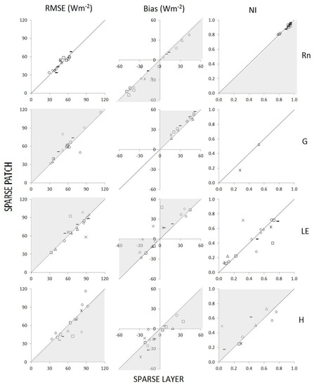 Performances of instantaneous retrievals from each unbounded model versions (patch vs. layer) at 13:30 for net radiation (Rn), soil heat flux (G), total latent heat flux (LE), and total sensible heat flux (H). (RMSE: root mean square error in W m−2; Bias: in W m−2; NI: Nash-Sutcliff efficiency Index). Grey zone matches area containing most of the points. Square symbols = Lamasquère, Circle symbols = Niger, Diamond symbols = Avignon, Triangle symbols = Tunisia, Cross symbol = Barbeau, String symbol = Auradé, Star symbol = Morocco.