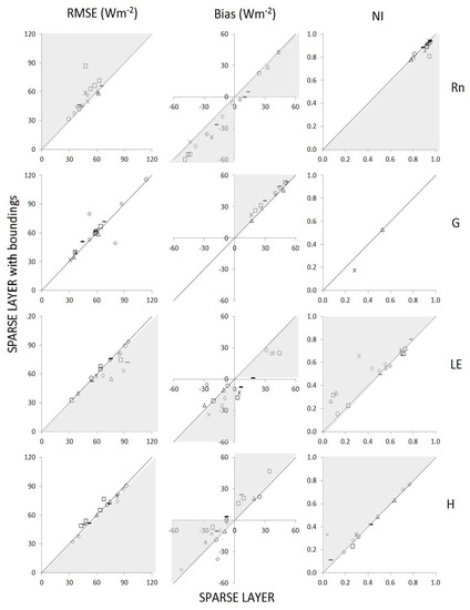 The global retrieval performances for the four energy balance components are reported in Table 2. For all data sets, the best LE estimates were obtained with the layer bounded version (global RMSE of 58 W m−2). The performances of H estimations were almost similar in the four experiments (similar RMSE and NI, but a smaller negative bias for the layer version).